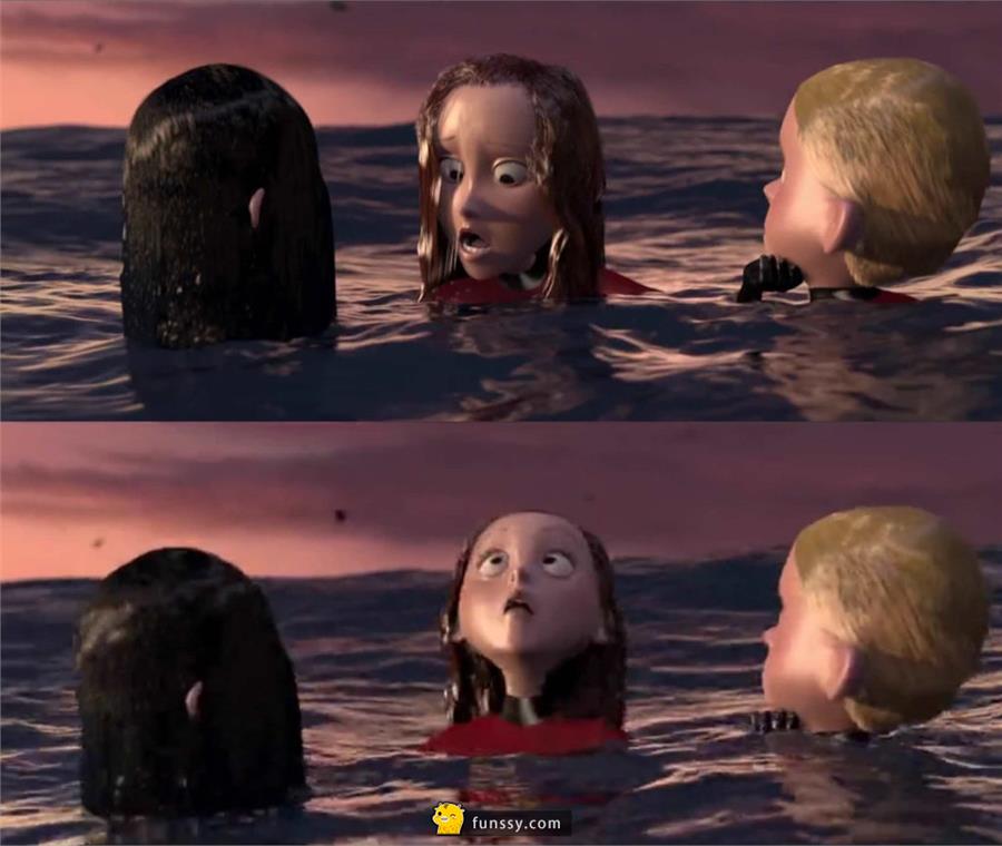 在《超人特攻隊》裡,當Helen發現飛機要掉在他們頭上時,其實是看到水中的倒影。