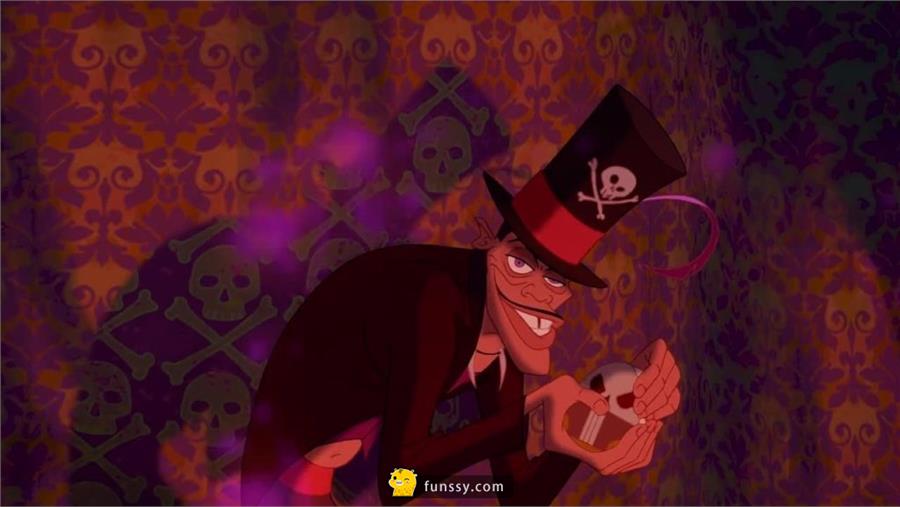 在《公主與青蛙》中,Facilier博士的影子讓牆壁上印出骷髏頭的圖案。